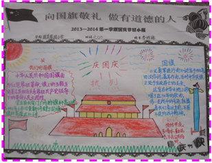 2013年国庆节期间,学校为了加强对学生的爱国主义教育,在传统的节日特色作业的的基础上,力求特色作业的创新,以“向国旗敬礼,做一个有道德的人”为主题,分三节层面进行,其一是:低中年级的国庆特色作业,其二是高年级的国庆节日小报,其三是美术彩虹社的节日特色小报。学生们通过特色作业的制作更加了解了祖国发展所取得的伟大成就,加深了对祖国的热爱之情。