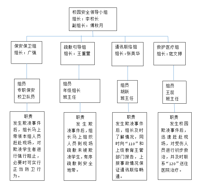 学校成立以校长李玮为组长,副校长傅秋月为副组长,张英华、寇文婷、赵鹏飞、茅宇、王重萱为组员的校园欺凌专项治理工作领导小组,下设宣传教育组、督导检查组、应急处置组负责指挥、协调和组织我校校园欺凌专项治理活动。