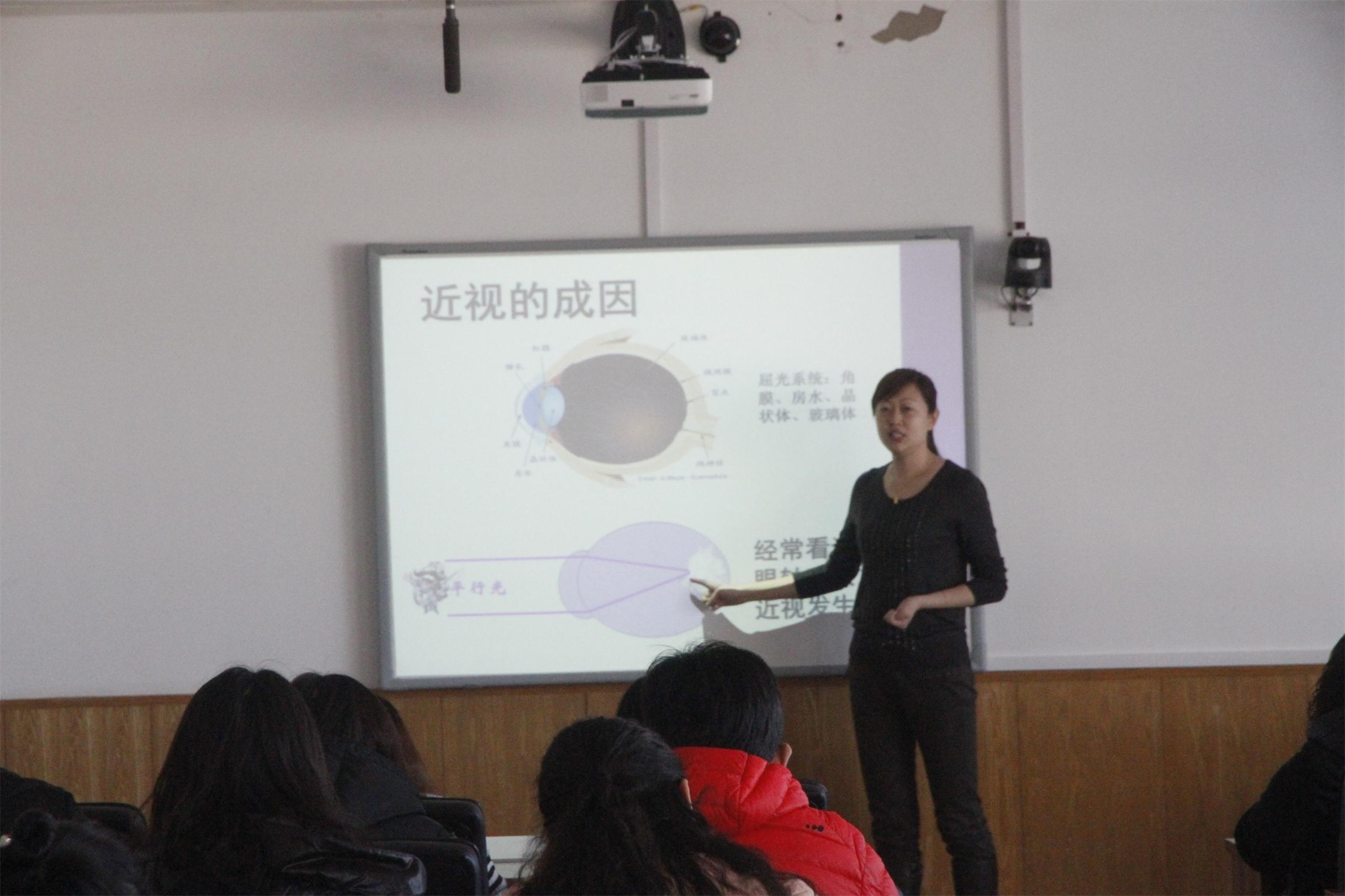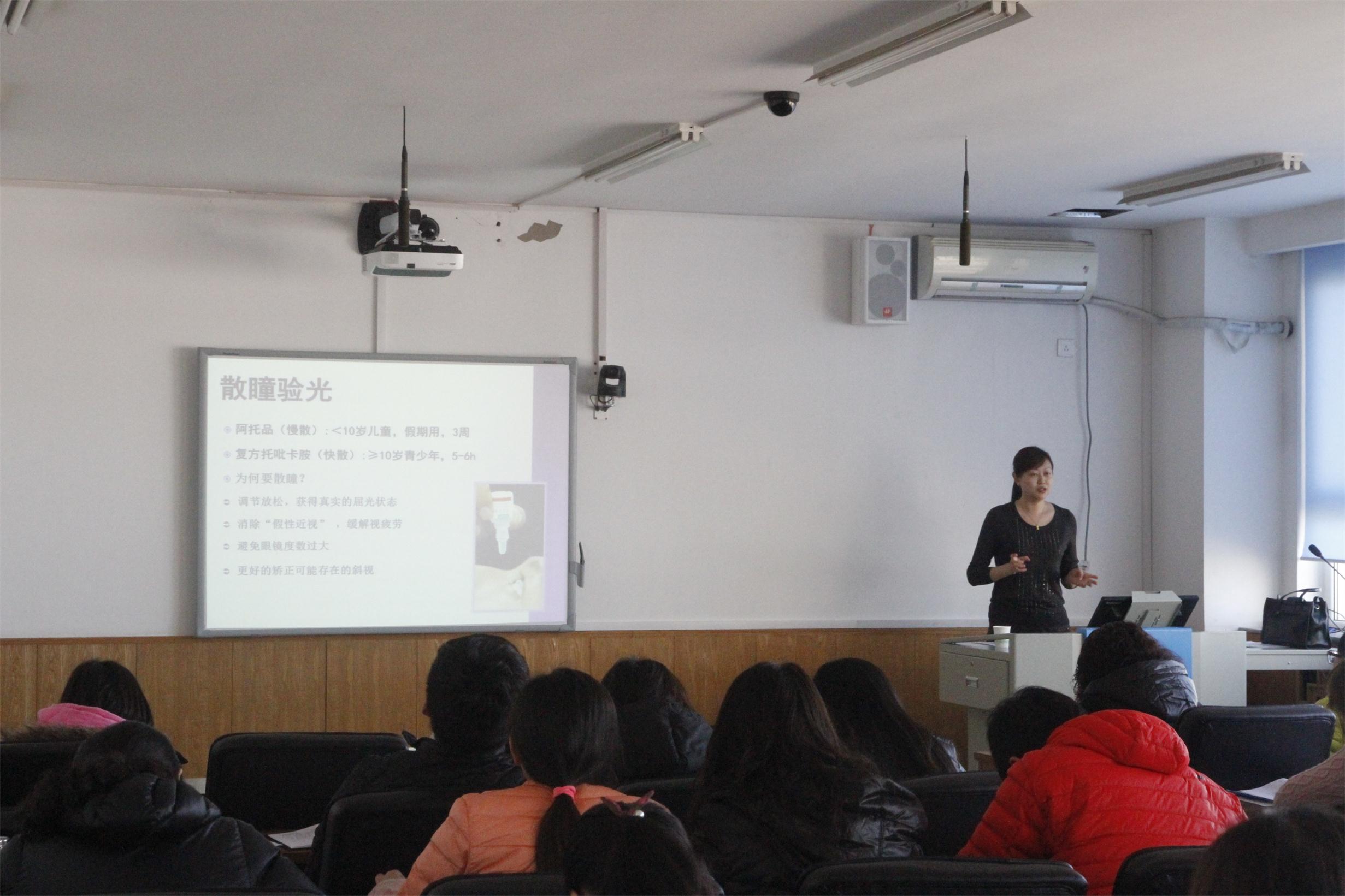 2015年3月13日,我校开展了“专家进校园 健康大讲堂”活动,邀请了北京市疾病预防控制中心学校卫生科的柳静医生为全校教师进行近视防治的相关知识培训。柳大夫向老师们通报了我校的视力不良患病情况并进行了细致分析,通过介绍近视的成因、真假近视的区别、近视的治疗方法,让老师们深入认识了近视。同时介绍了学校防治近视的措施,让老师们认识到:只要为学生创设优良的用眼环境,合理使用多媒体,正确认真做好眼保健操,督促学生休息眼睛,科学治疗假性近视,正确配戴眼镜等,就可以有效预防近视下降。全校近60位老师参与了此次讲座,为我校对视力不良的联防联控起到了深远影响。